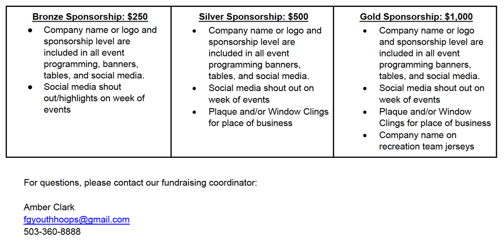 If you or your business are interested in becoming a FGYB sponsor, reach out to us at: fgyouthhoops@gmail.com. Our Fundraising Coordinator can provide you with our sponsorship letter that outlines more details about each level of sponsorship.